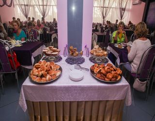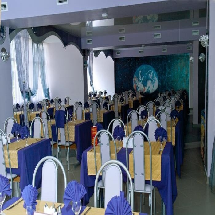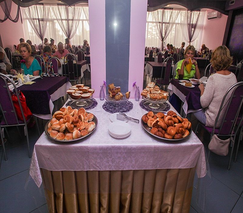 Постояльцам предлагается питание по системе «Шведский стол». Также на территории есть мангальная зона, где можно приготовить мясо или овощи самостоятельно. В центре поселка находятся кафе, столовые и рестораны.